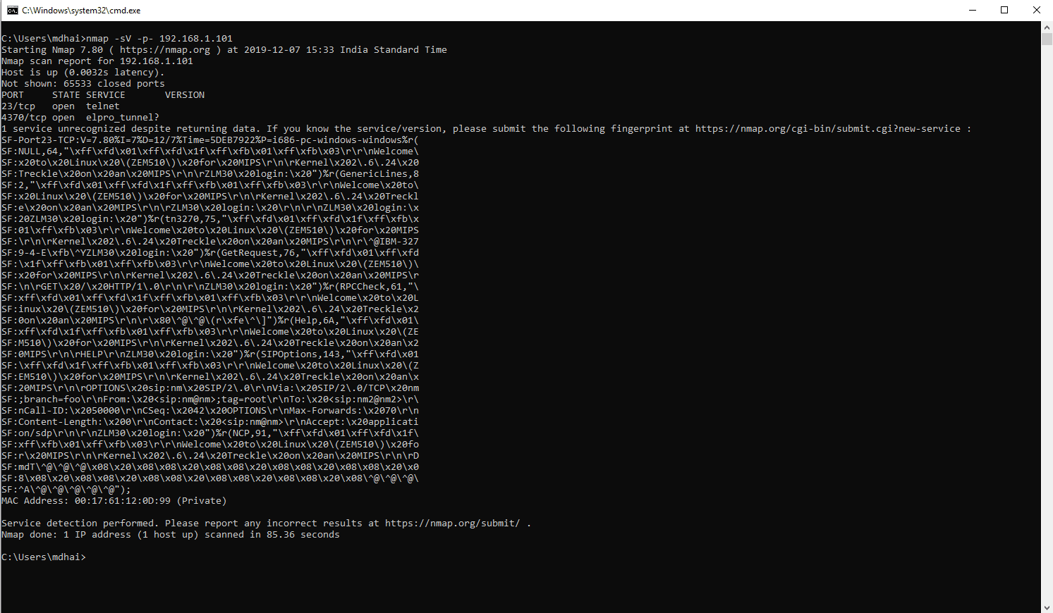 From the above command, we fetched the output wherein we found that the Telnet port is open.